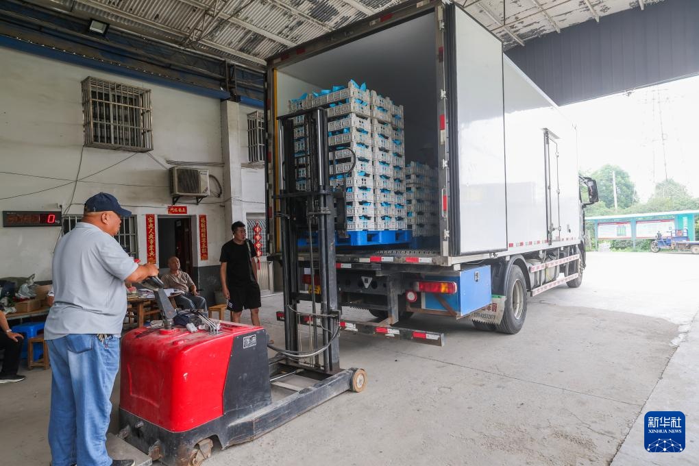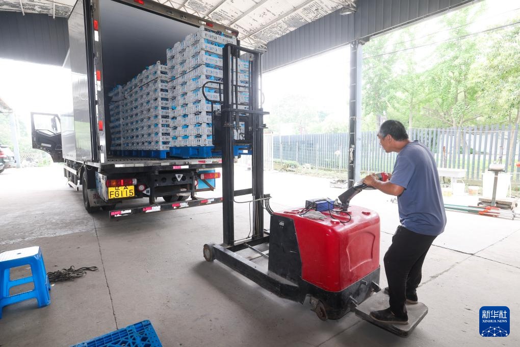 6月25日,慈溪市坎墩街道农创园的慈溪市绿琴果蔬农场内,工作人员在把采收的葡萄装车运往外地。