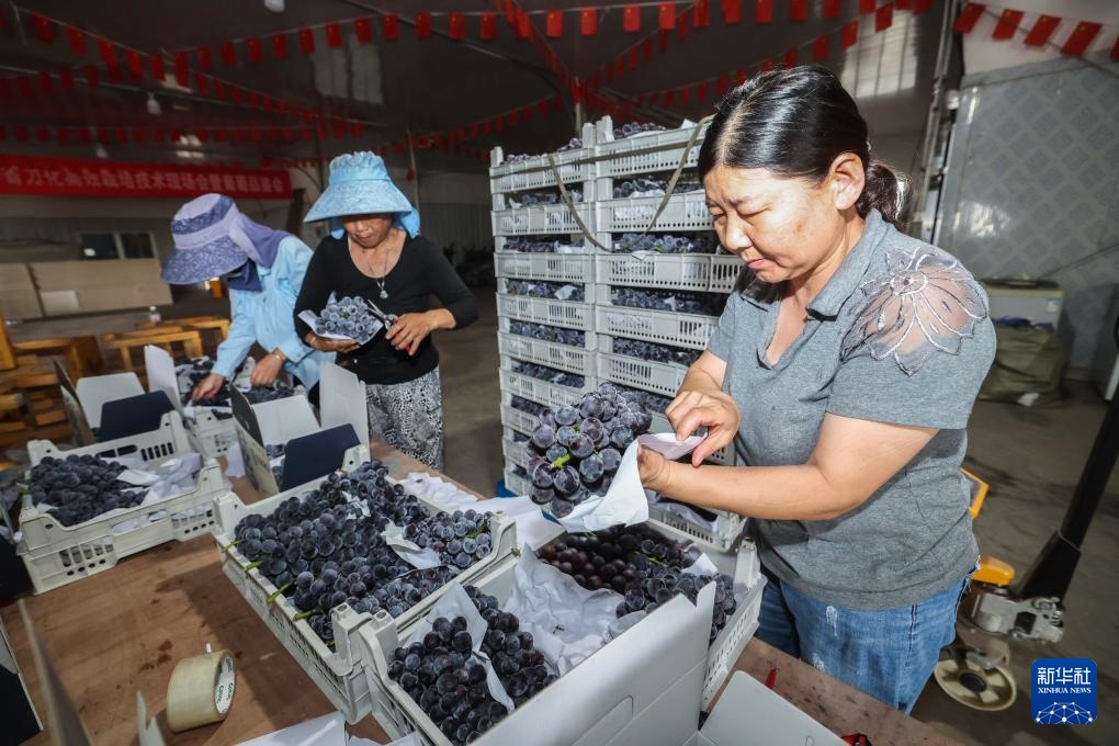 6月25日,在慈溪市坎墩街道农创园的慈溪市绿琴果蔬农场内,工作人员将采收的葡萄分拣、装盒。