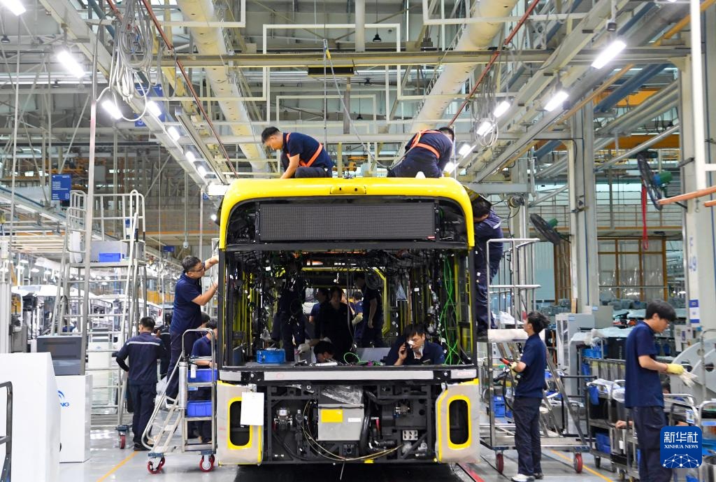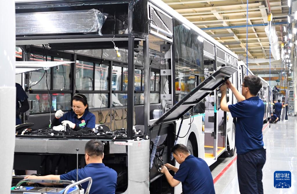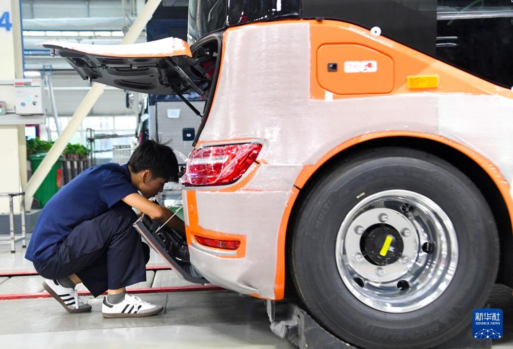 6月26日,工作人员在宇通新能源厂区海外承装车间作业。