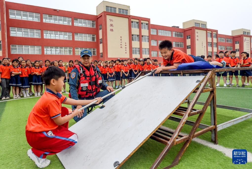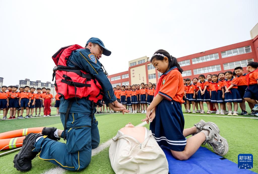 暑假临近,河北省邯郸市邱县第二中学附属小学开展安全教育活动,学生在蓝天救援队的指导下学习防溺水常识、演练急救技能,提高安全意识和自救能力。