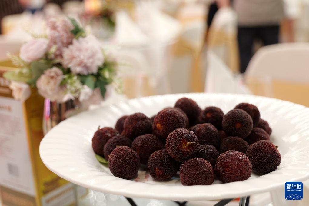 这是6月24日在德国法兰克福一家餐厅拍摄的东魁杨梅。