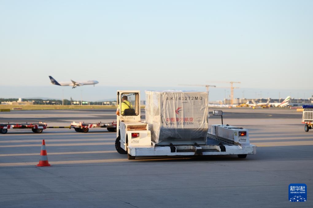 6月24日,在德国法兰克福国际机场,一名工作人员运送装有东魁杨梅的航空集装箱。