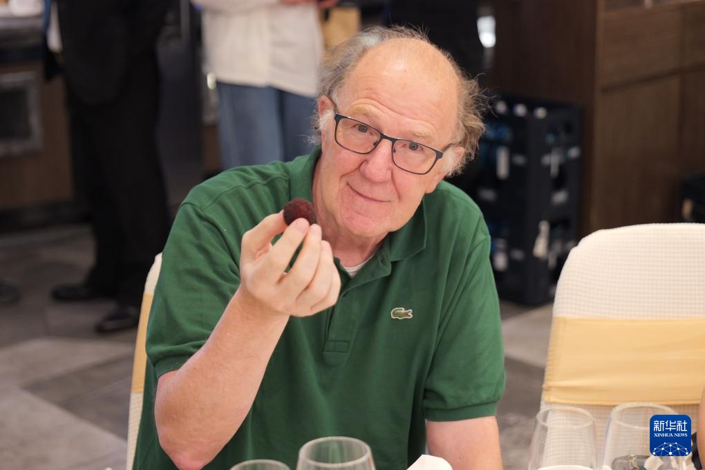 6月24日,在德国法兰克福一家餐厅,一名客人品尝新鲜的东魁杨梅。