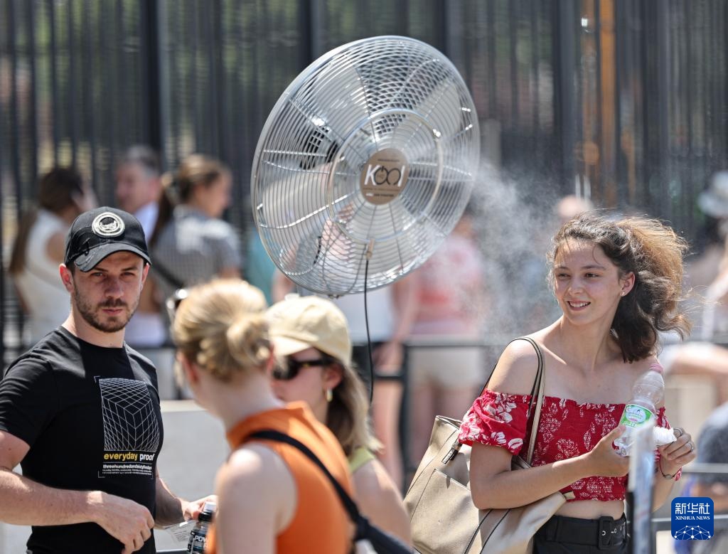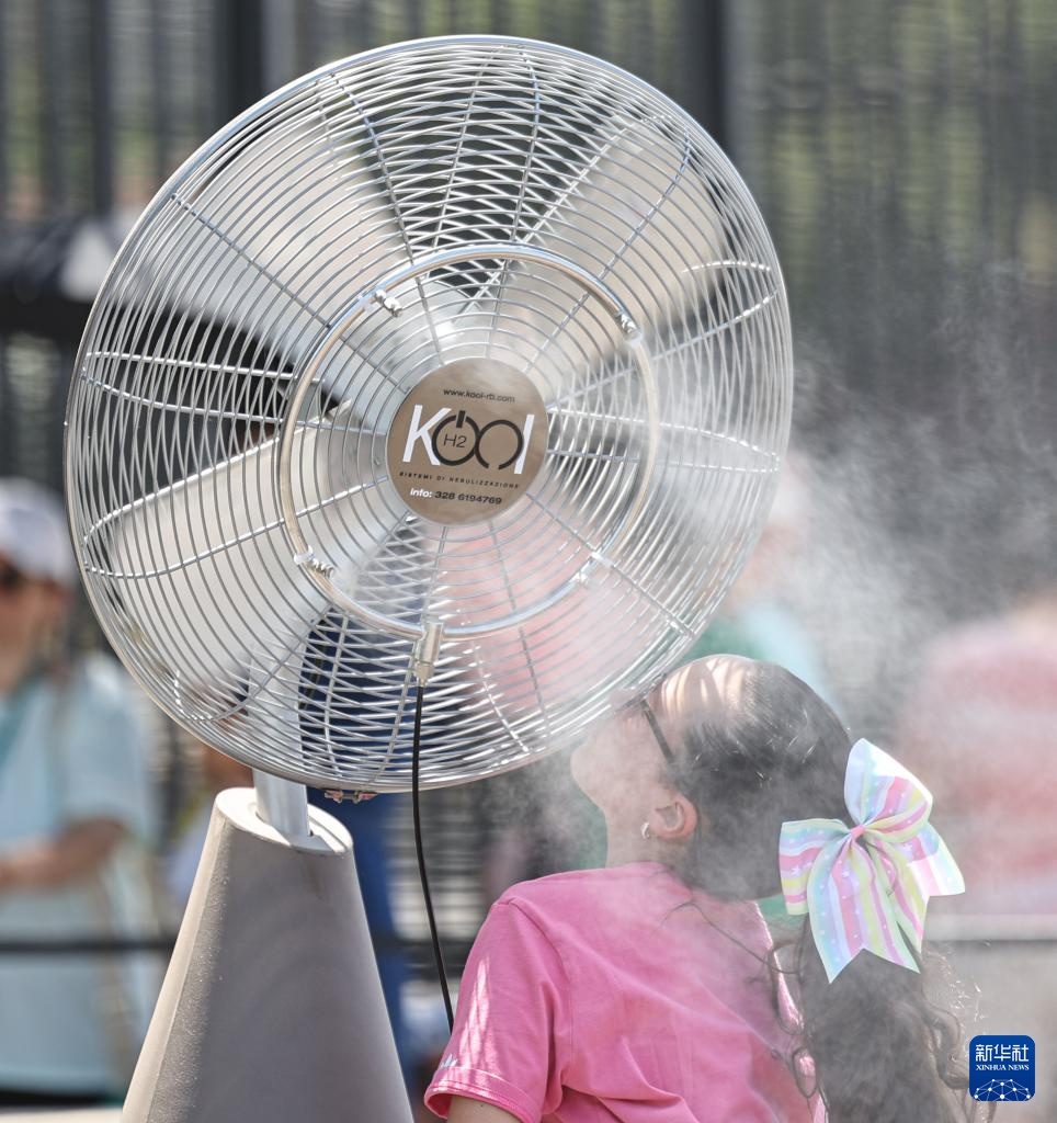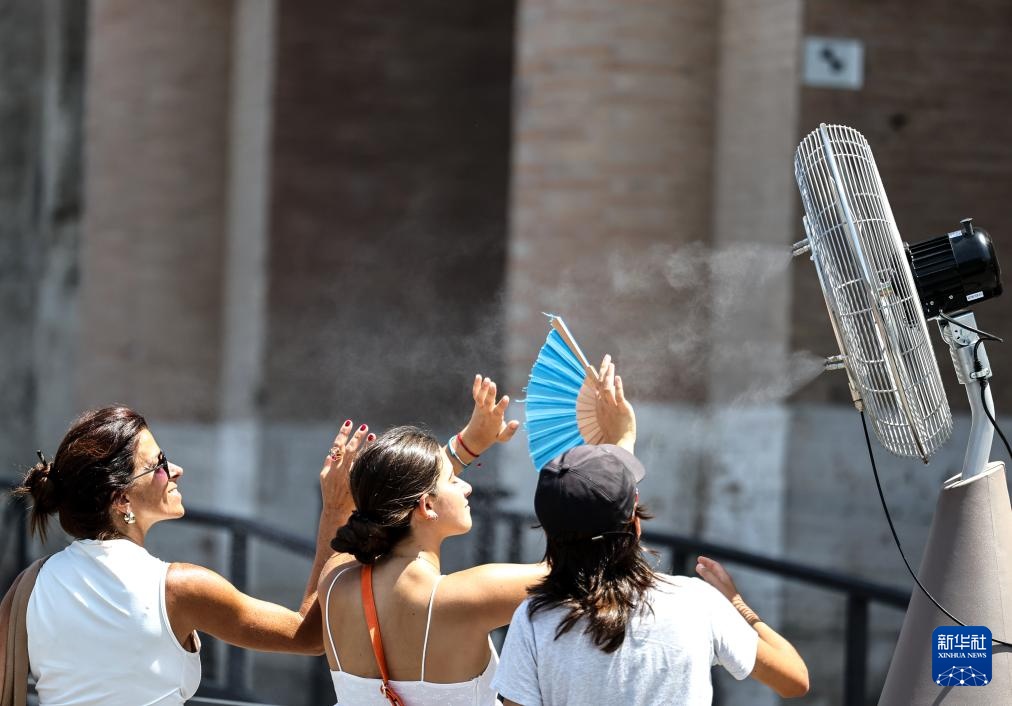 6月27日,在意大利罗马,游客在斗兽场附近一处风扇下纳凉。