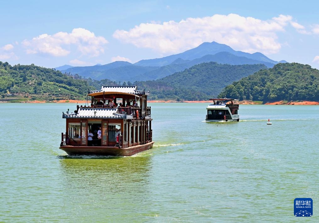 6月26日,游客在福建省宁德市古田县的国家4A级旅游景区翠屏湖上乘坐游船观光。