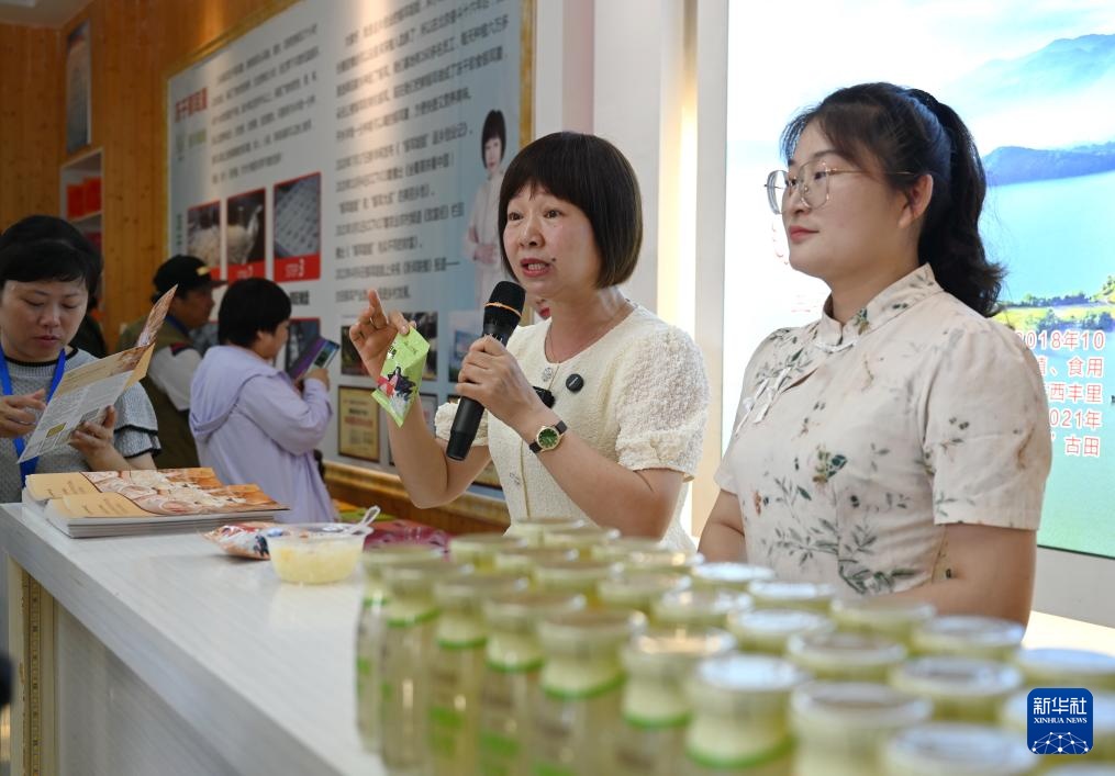 6月26日,福建省宁德晟农农业开发有限公司总经理张家巧(右二)向参观者介绍绿色食品古田银耳羹。