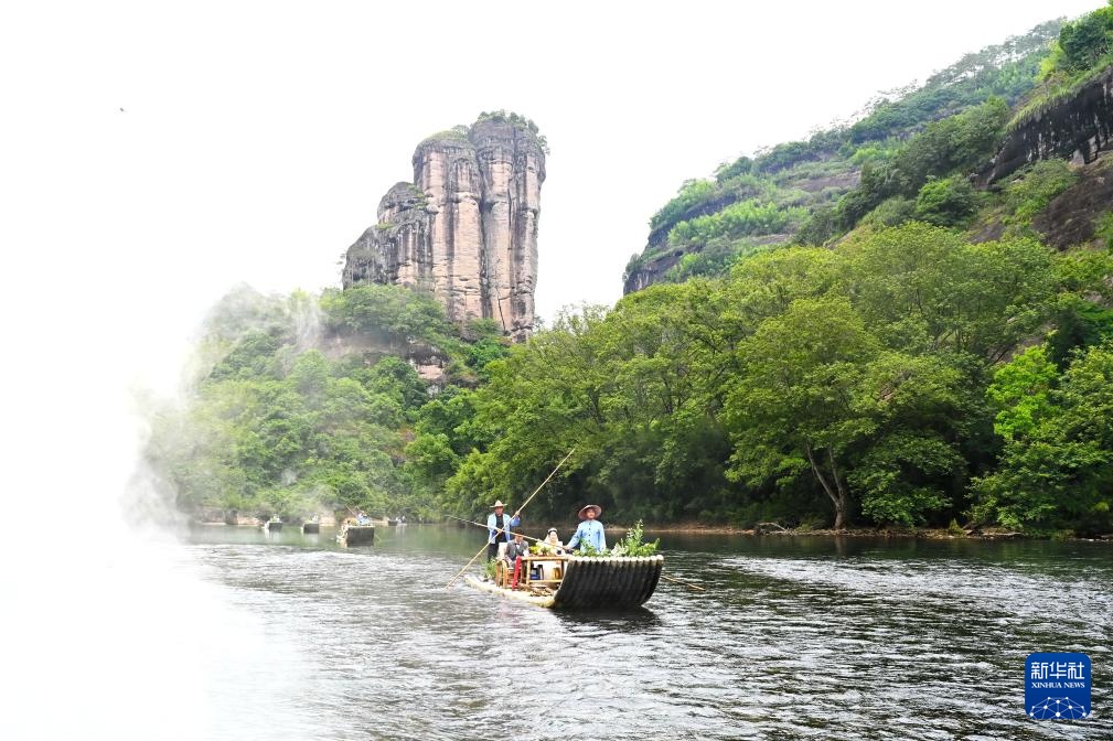 游客在世界自然和文化双遗产的武夷山国家公园内的九曲溪乘坐竹排体验漂流(2022年5月20日摄)。