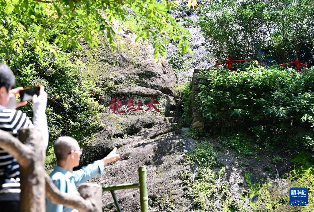 6月25日,游客在福建武夷山风景名胜区参观生长在武夷山九龙窠高岩峭壁上的大红袍茶树母株。