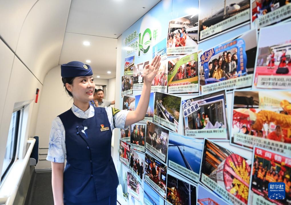 6月25日,中国铁路南昌局集团有限公司福州客运段列车长李晓若在G3089次动车上介绍合福高铁开通十年来留下的美好故事。