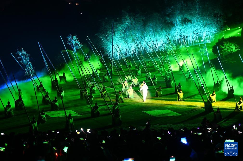 以世界自然和文化双遗产地武夷山为地域背景,将自然景观、茶文化及民俗融于一体的《印象大红袍》表演(4月21日摄)。