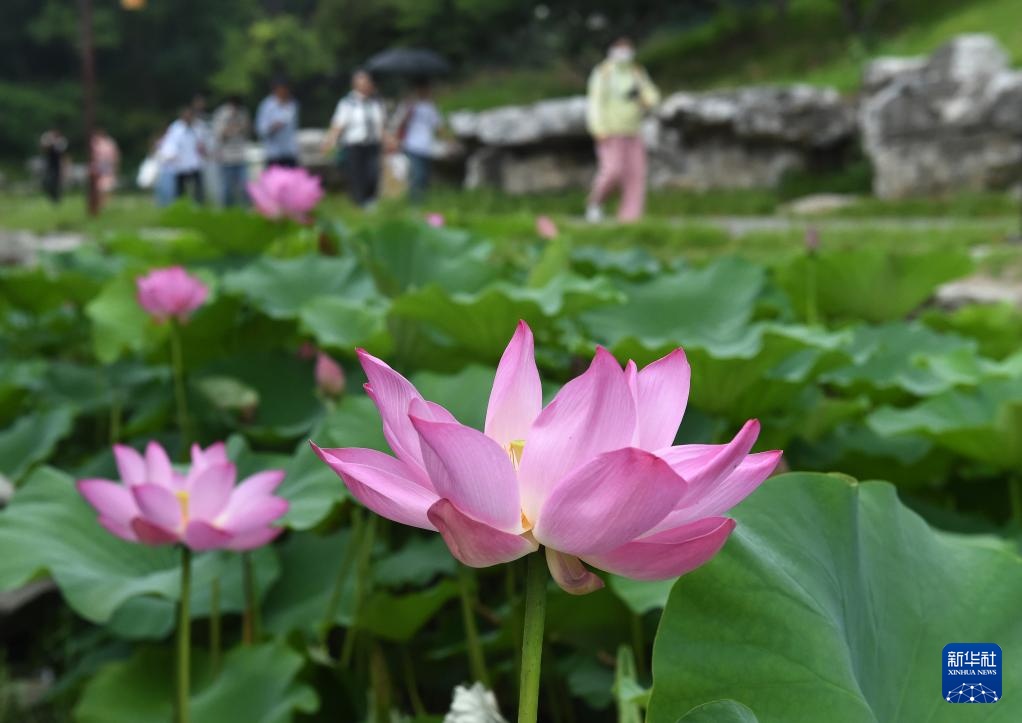 6月28日,游客在在圆明园“荷韵梅芳 御苑双姝”双花展上拍摄。