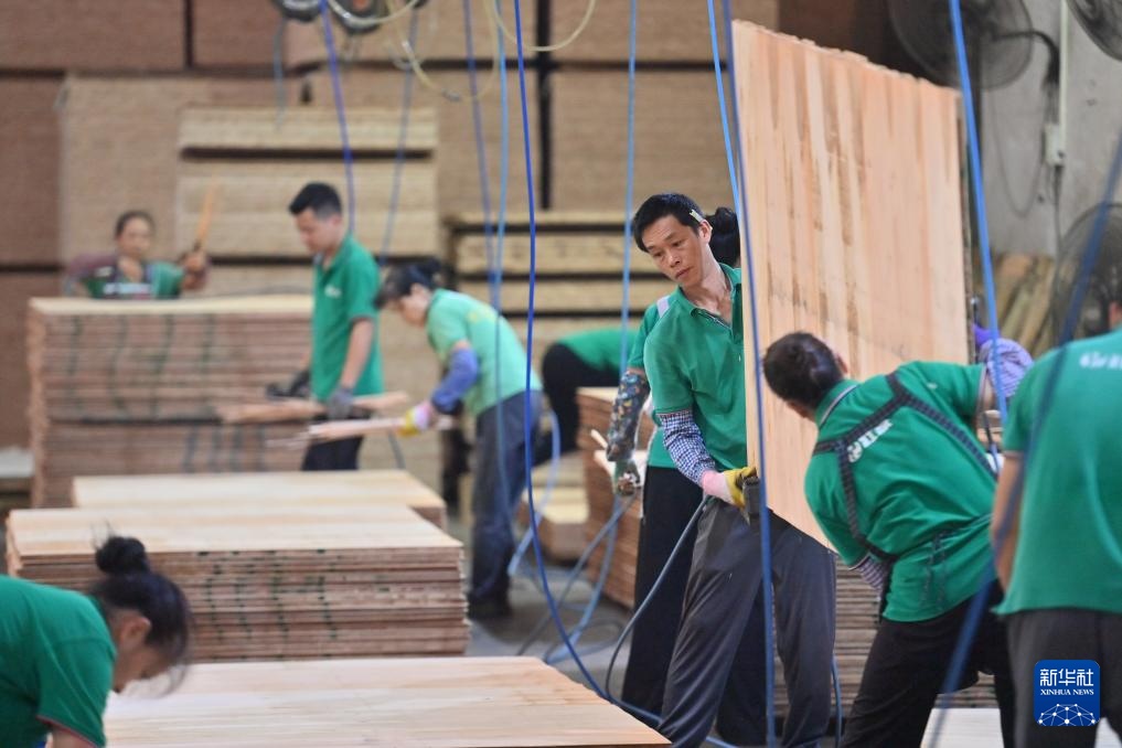 6月29日,工人在融安县一家香杉生态板生产企业的生产线上作业。
