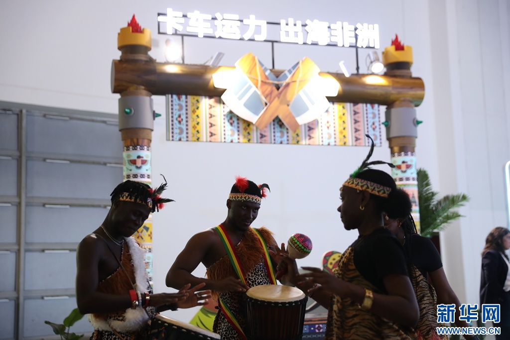 7月1日,非洲演员在一家参展企业展位前表演节目。