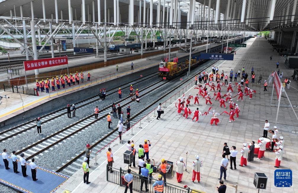7月1日在延安站拍摄的西延高铁轨道贯通仪式(无人机照片)。