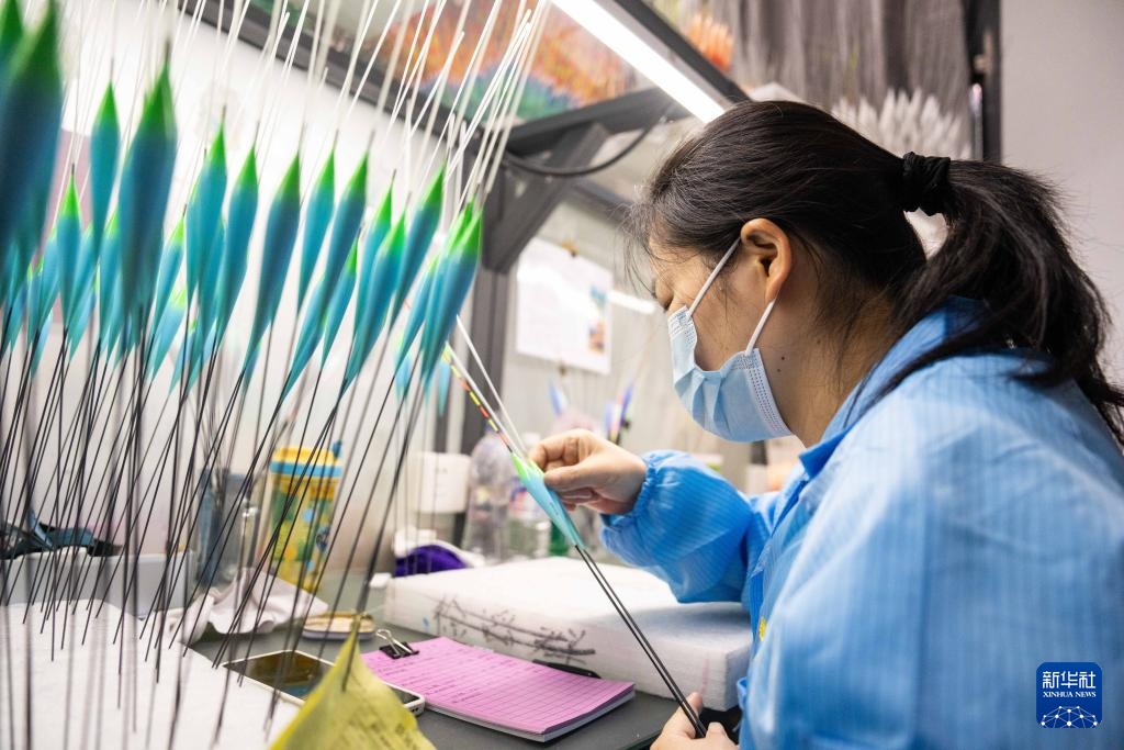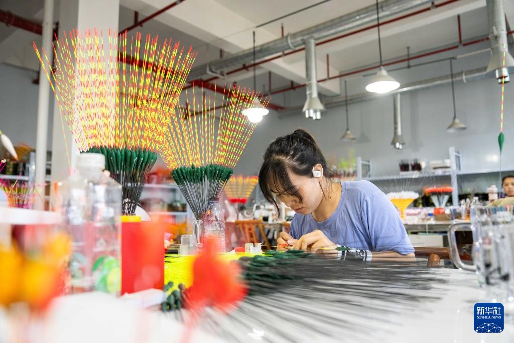 7月1日,在位于临湘市浮标小镇的临湘民间艺人钓具有限公司生产车间,工人在生产浮标。
