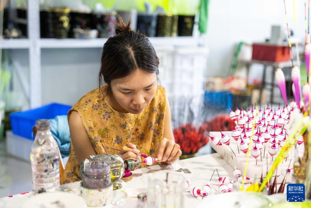 7月1日,在位于临湘市浮标小镇的湖南瑞琦户外用品有限公司生产车间,工人在生产假饵。