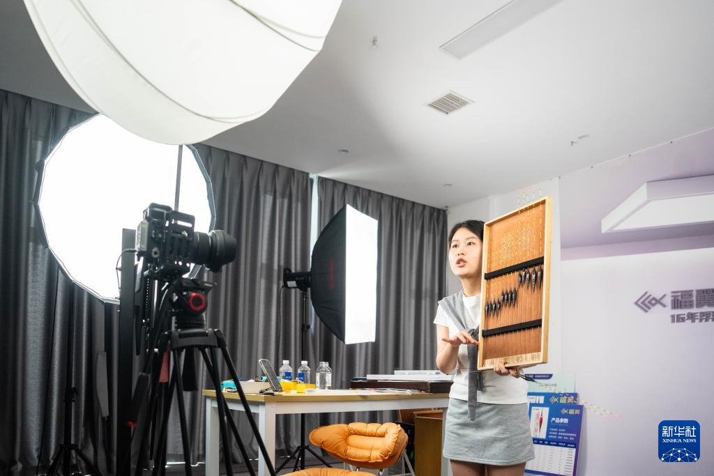 7月1日,在位于临湘市浮标小镇的湖南福翼钓具有限公司直播间,工作人员通过直播推销钓具。