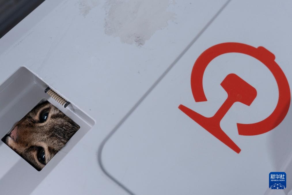 7月1日,一只宠物猫在专用宠物运输箱内“等待乘车”。