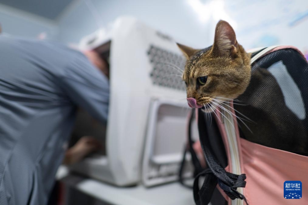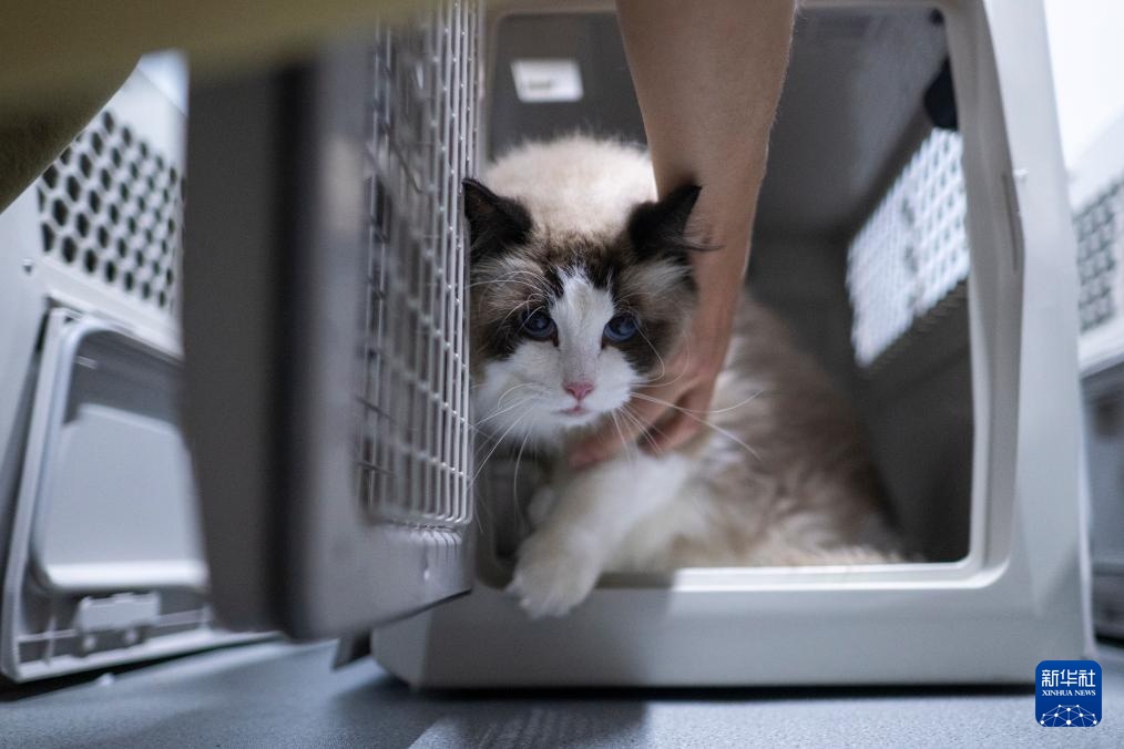 7月1日,一只宠物猫被旅客放进专用宠物运输箱内。