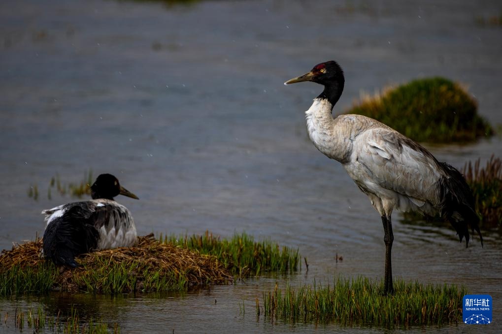 一对黑颈鹤在西藏那曲市申扎县的湿地上“换班”照顾刚出壳的雏鸟(6月4日摄)。