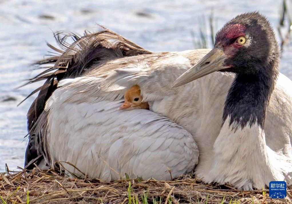 一对黑颈鹤在西藏那曲市申扎县的湿地上照顾刚出壳的雏鸟,一只将其护在身下保持温暖,另一只则在旁保持警戒(6月4日摄)。
