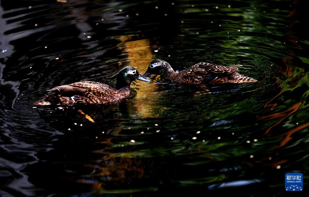 两只水鸟在英国伦敦湿地中心的水中游弋(6月20日摄)。