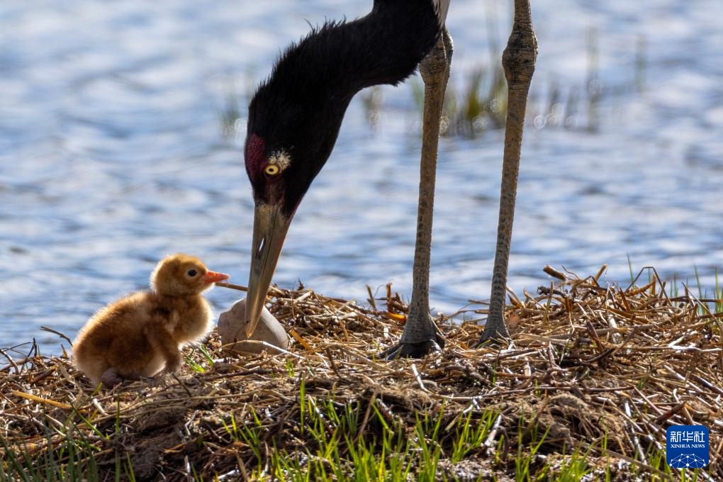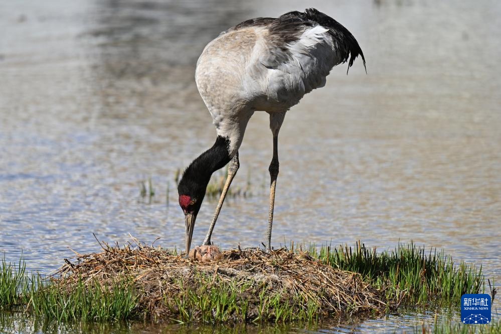在西藏那曲市申扎县,一只黑颈鹤查看刚出壳雏鸟的情况(6月4日摄)。