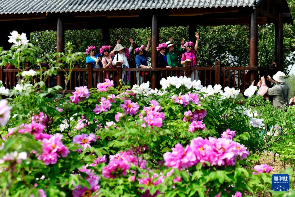 4月8日,在菏泽市曹州牡丹园,盛开的牡丹吸引游客驻足欣赏。