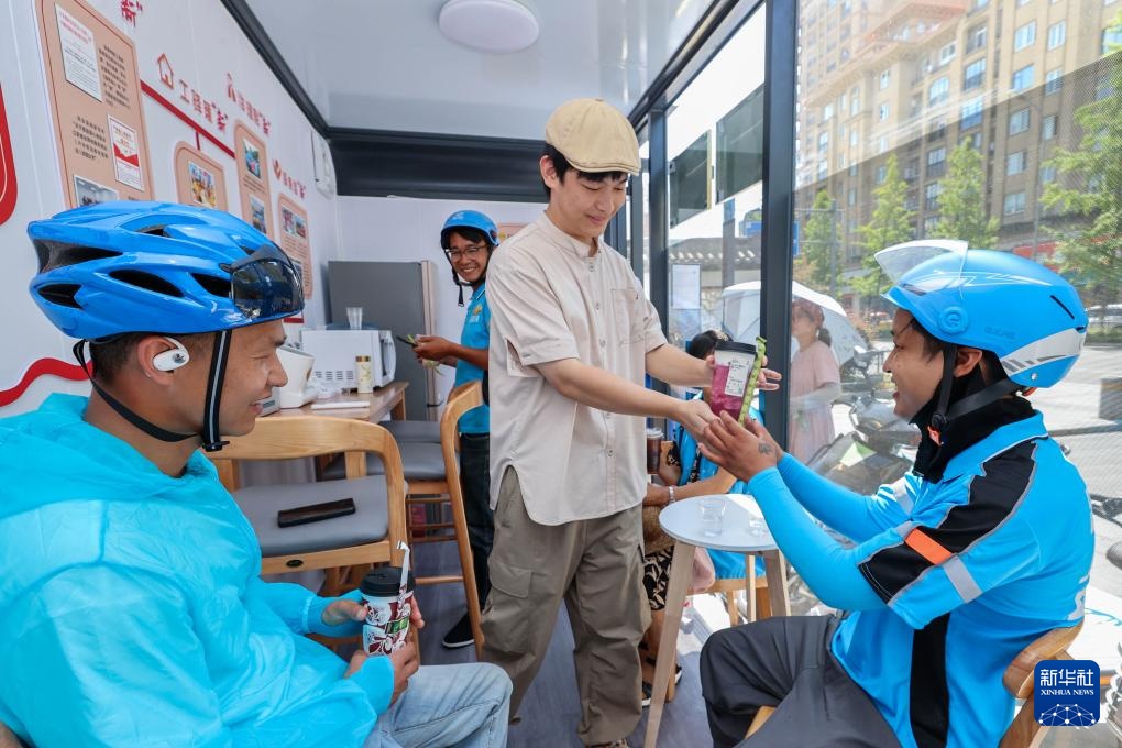 7月2日,在浙江省湖州市德清县总工会设置的工会驿站里,爱心商家为外卖小哥送上冷饮。