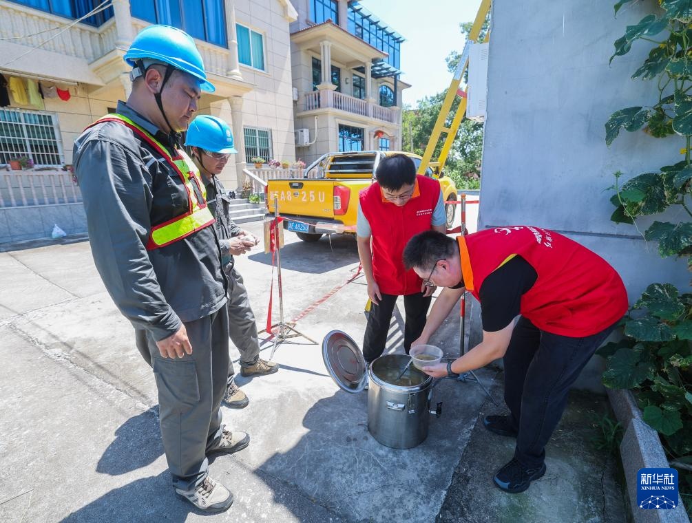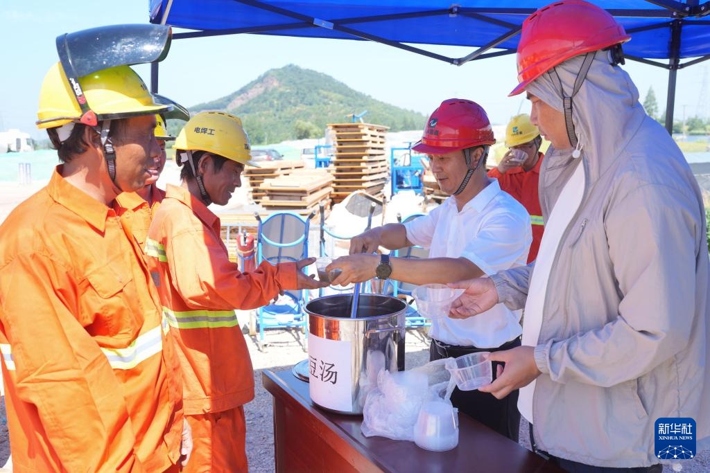 7月3日,在浙江省湖州长兴县画溪街道白莲桥村,国网湖州供电公司工会工作人员(右一、右二)为户外工作者送上绿豆汤。