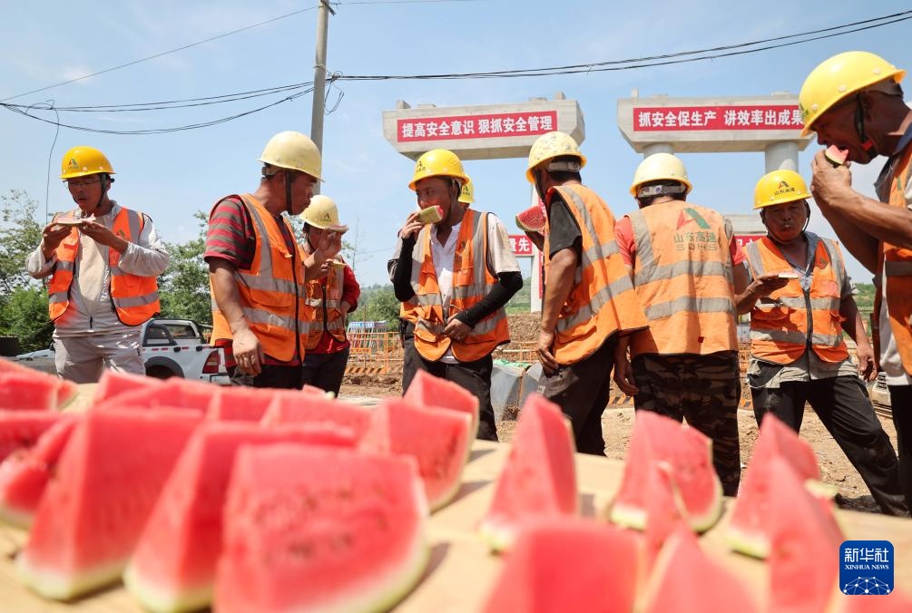 7月3日,在山东省临沂市沂南县铜井镇董梁高速第四标段施工现场,工人们在休息区吃西瓜解暑。