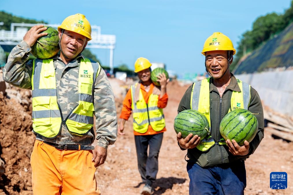 7月2日,在浙江长兴的申苏浙皖高速改扩建项目施工现场,工人领取西瓜。