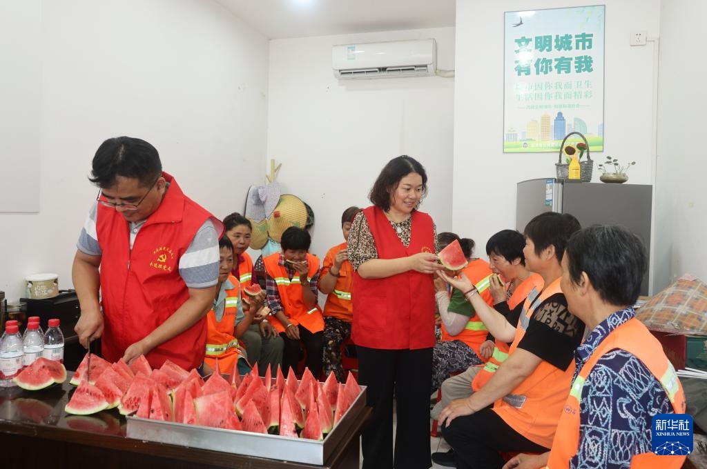 7月3日,在浙江省湖州市德清县乾元镇务前街环卫工人驿站,志愿者为环卫工人送西瓜。
