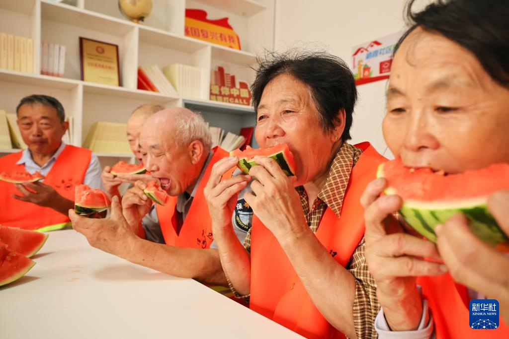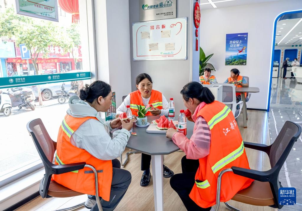 7月3日,在江苏连云港市墟沟街道栖霞社区爱心驿站,环卫工人吃西瓜消暑。
