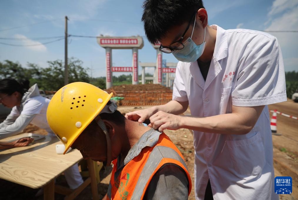 7月3日,在山东省临沂市沂南县铜井镇董梁高速第四标段施工现场,铜井镇卫生院的医务人员给工人贴防暑贴。
