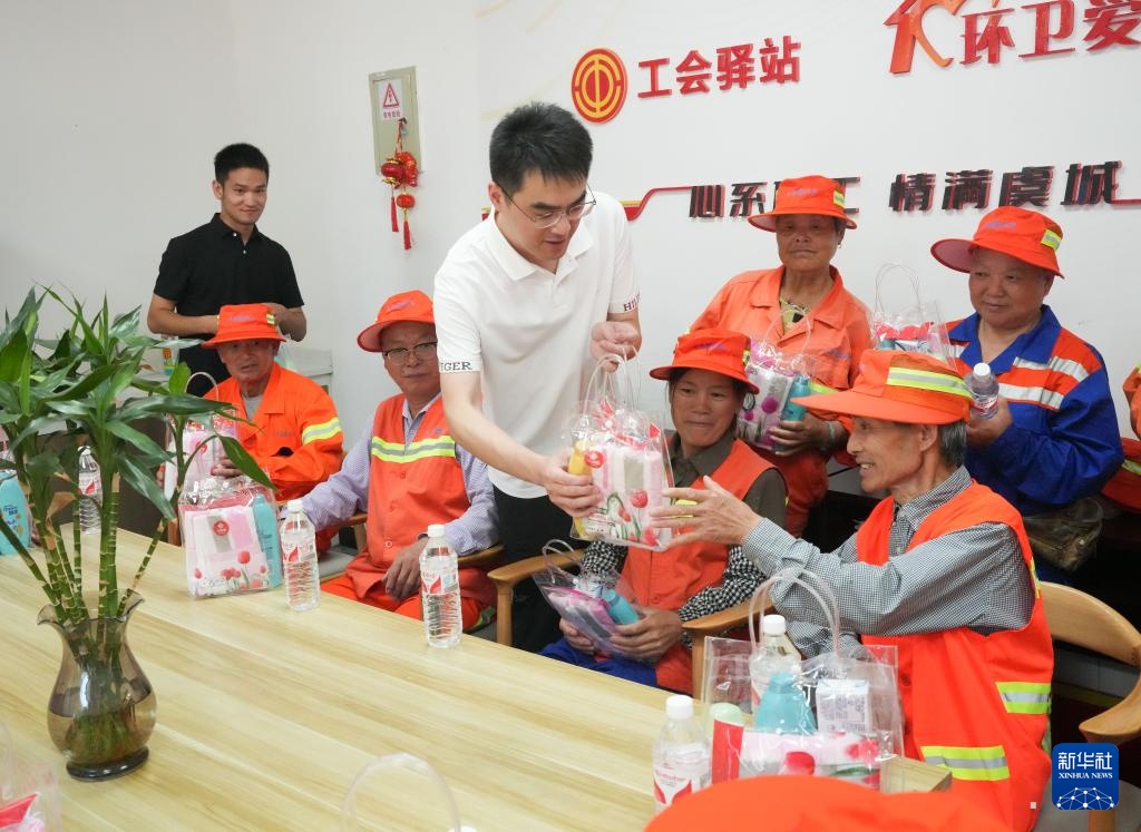 7月3日,在浙江省绍兴市上虞区百官街道环卫驿站,工作人员为一线环卫工人送上避暑慰问品。