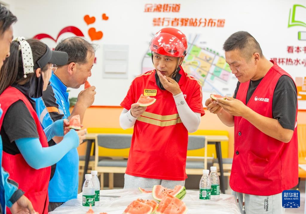 7月2日,在江苏省南通市通州区金沙街道南山社区“骑行者驿站”,外卖骑手吃西瓜休息纳凉。