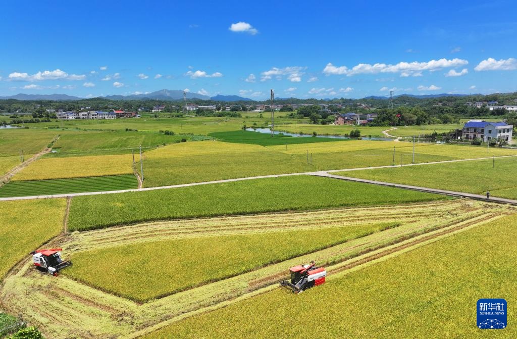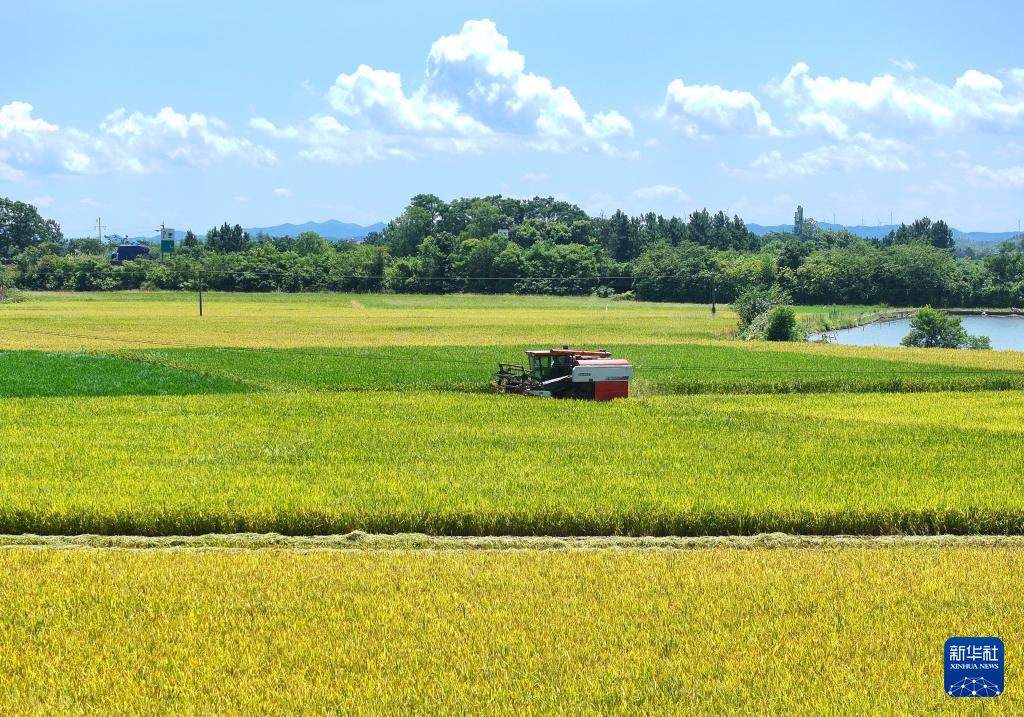 湖南省衡阳市衡山县种植的早稻次第成熟进入收割季,当地村民抢抓晴好天气驾驶农机收割早稻。
