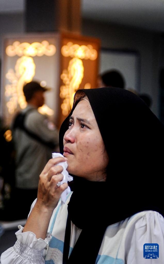7月3日,在印度尼西亚东爪哇省的吉打邦港,一名乘客的亲属等待消息时擦拭眼泪。