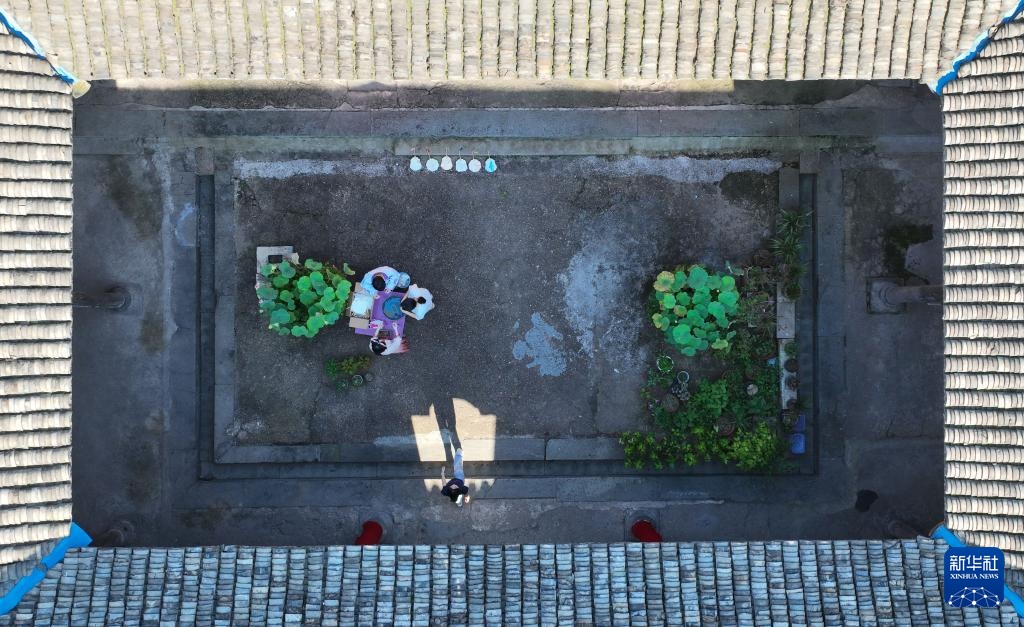 7月3日,游客在五泄镇古民居内体验漆扇制作(无人机照片)。