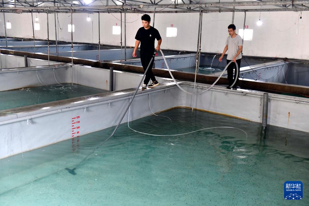 7月4日,在日照市东港区涛雒镇一处育苗基地,工作人员在查看鱼苗长势。