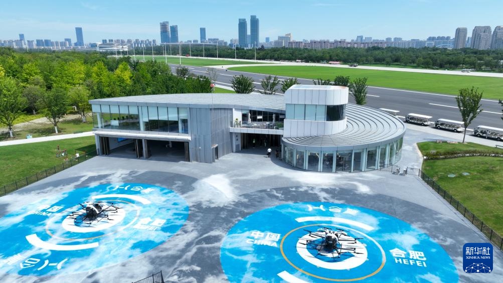7月2日,两架电动垂直起降飞行器(eVTOL)停放在合肥城市空中交通枢纽港(无人机照片)。