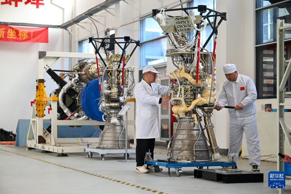 在位于安徽省蚌埠市的安徽九州云箭航天技术有限公司,技术人员对即将交付的液体火箭发动机进行检查(2024年3月11日摄)。