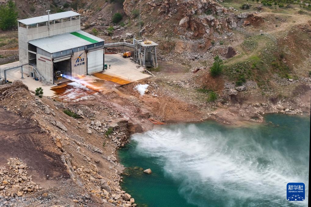 在安徽省蚌埠市禹会区大洪山火箭发动机试验场,安徽九州云箭航天技术有限公司研发生产的“龙云”发动机进行点火测试(4月24日摄,无人机照片)。