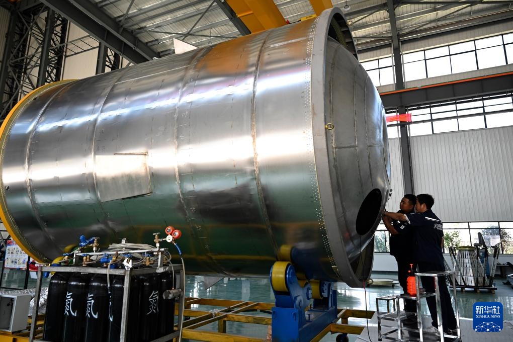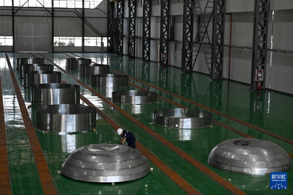 7月3日,在位于安徽省蚌埠市的深蓝太空航天科技(蚌埠)有限公司,工作人员在查看火箭燃料贮箱的箱体组件。