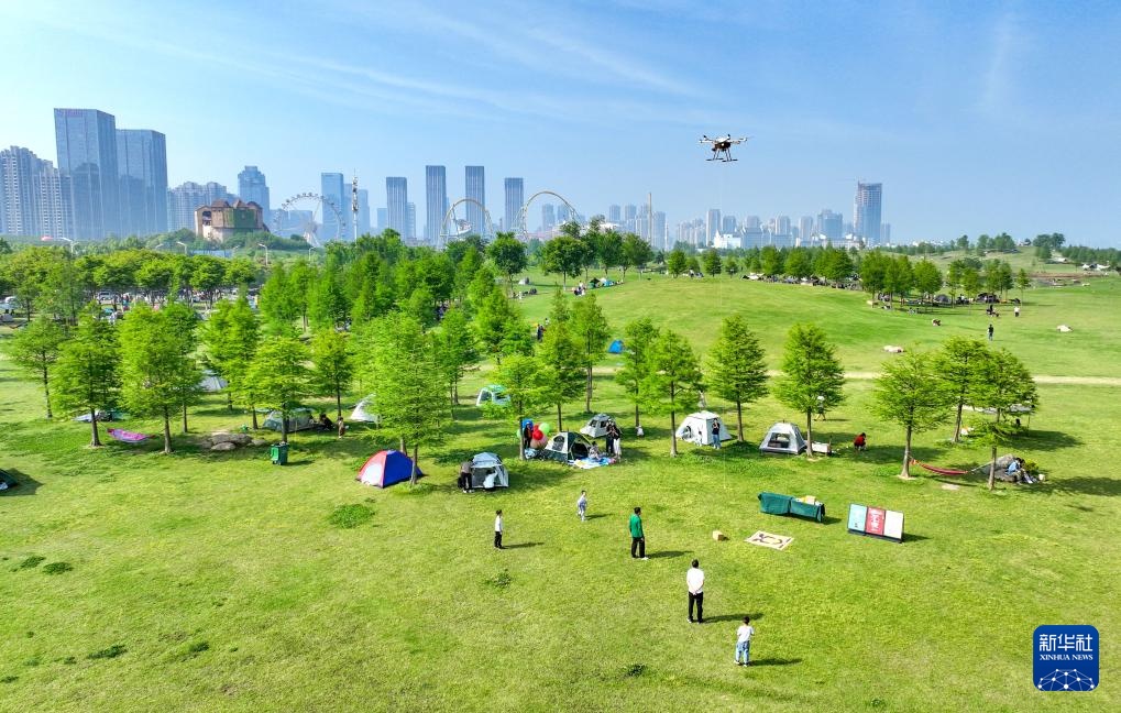 无人机在安徽省合肥市岸上草原配送外卖(2024年4月29日摄,无人机照片)。