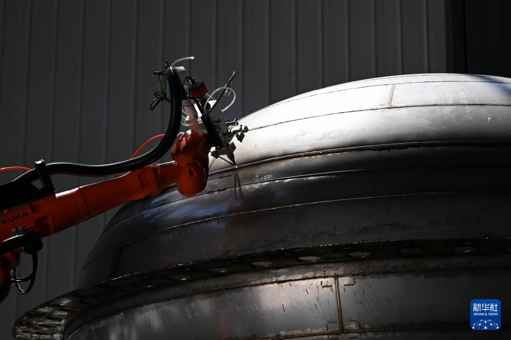 7月3日,在位于安徽省蚌埠市的深蓝太空航天科技(蚌埠)有限公司,焊接机器人在对火箭燃料贮箱箱底进行焊接。