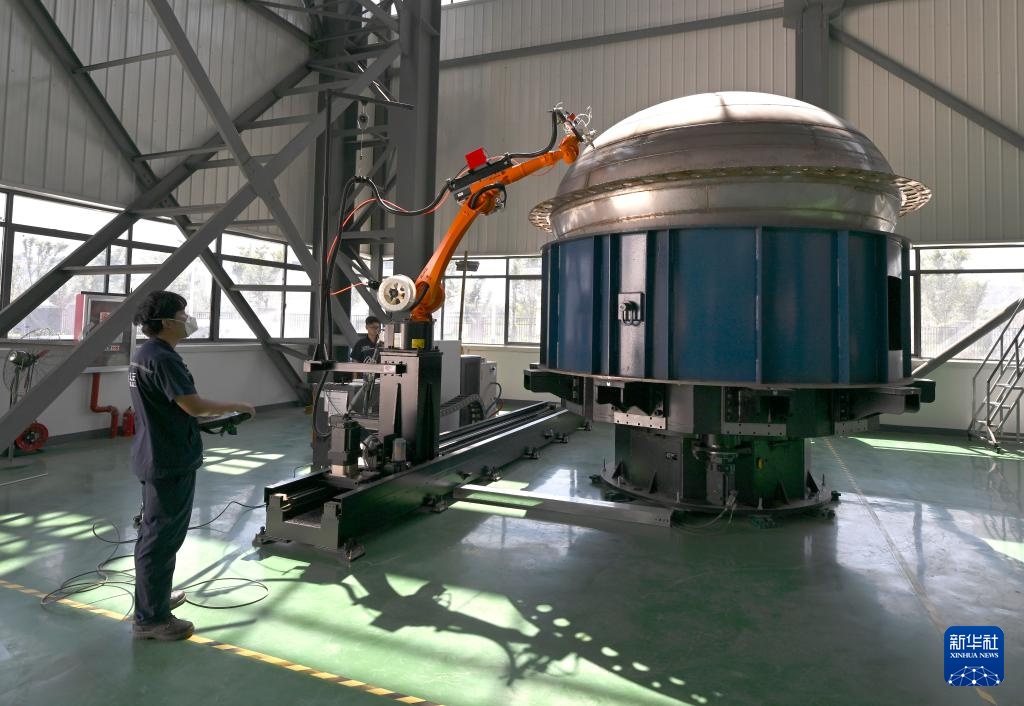7月3日,在位于安徽省蚌埠市的深蓝太空航天科技(蚌埠)有限公司,工作人员操作焊接机器人对火箭燃料贮箱箱底进行焊接。
