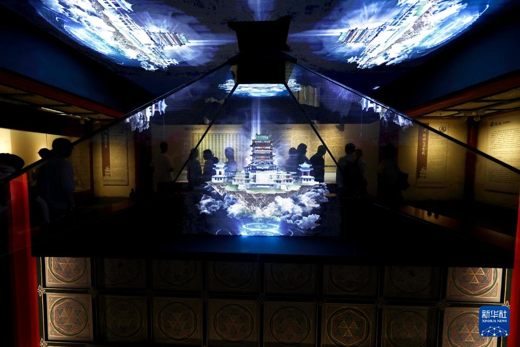 7月7日,游客参观江西南昌滕王阁内的历代滕王阁建筑景观全息数字复原展示。