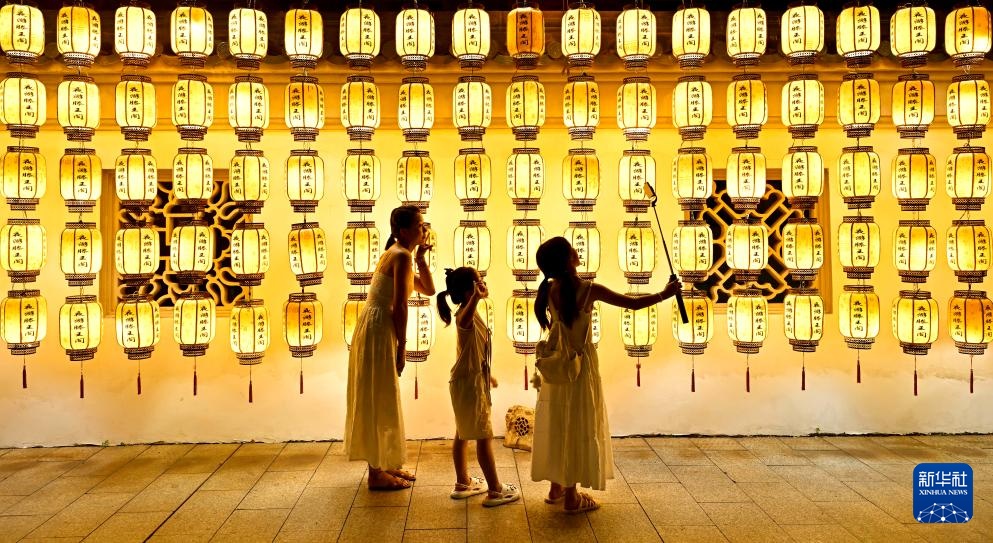7月7日,游客在江西南昌滕王阁景区附近的半步街打卡留影。